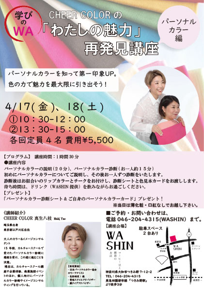 《学びのWA》4/17(金)、18(土) 「『わたしの魅力』再発見講座(パーソナルカラー編)」開催のお知らせ。