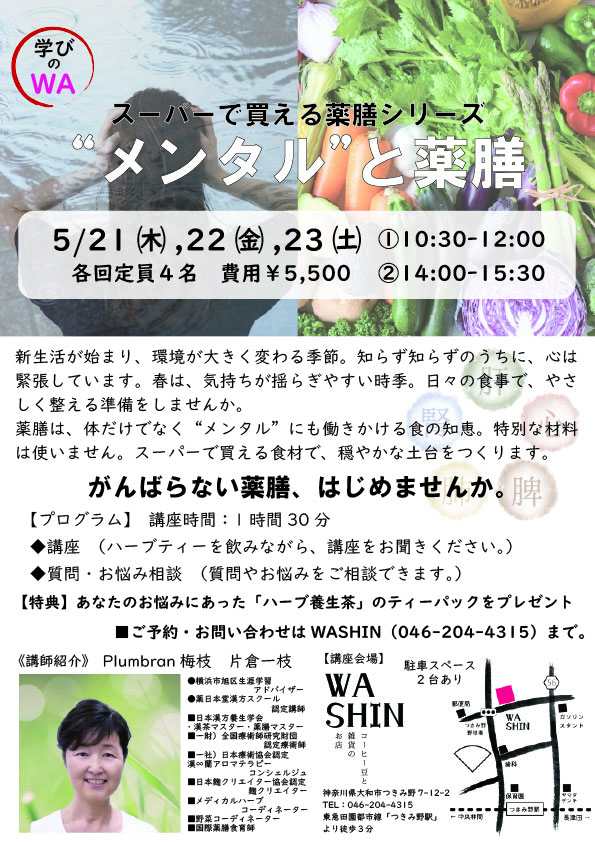 《学びのWA》5/21(木)、22(金)、23(土) スーパーで買える薬膳シリーズ『メンタルと薬膳』講座開催のお知らせ。