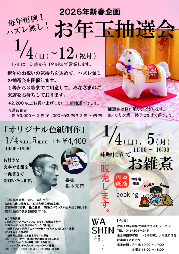 【2026年新春企画】お年玉抽選会、オリジナル色紙制作、お雑煮テント販売を開催します。