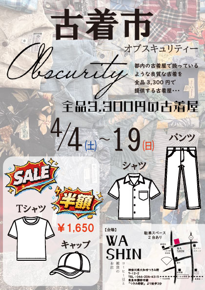4月4日(土)から16日間、WASHIN店内で「オブスキュリティー」の古着を販売します!